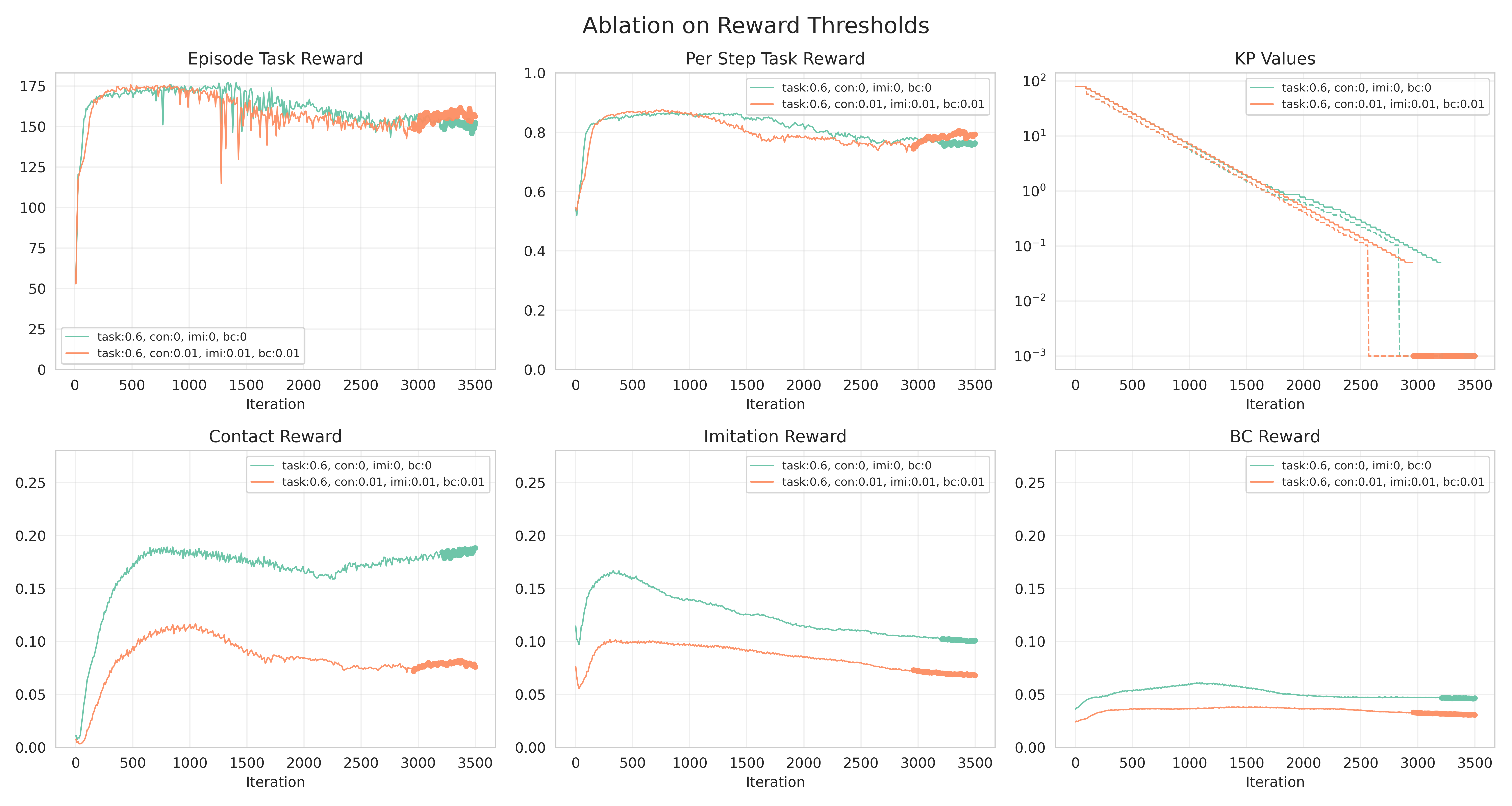 We keep a separate deque and threshold for each reward term (i.e. task reward, contact reward, imitation reward), and only decay the curriculum's VOC controller gains when the achieved rewards are above the given threshold. In the below experiments, we keep the task reward threshold the same (0.6) and compare using 0.01 vs 0 for the auxiliary rewards thresholds. We observe that, while the two cases achieve similar task reward after VOC controller gains are decayed to zero and both have a downward trend on the auxiliary rewards, having a non-zero threshold helps the policy achieve higher auxiliary rewards, and we qualitatively see a style difference in the learned policy behaviors. This suggests our framework offers flexibility that allows a user to adjust the policy behaviors by tuning these thresholds while not interfering with the task performance.